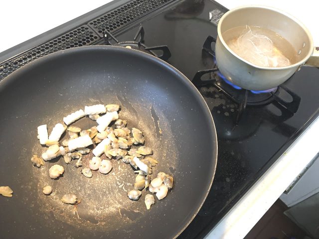 シーフードミックスはお湯、塩、料理酒で茹でます。