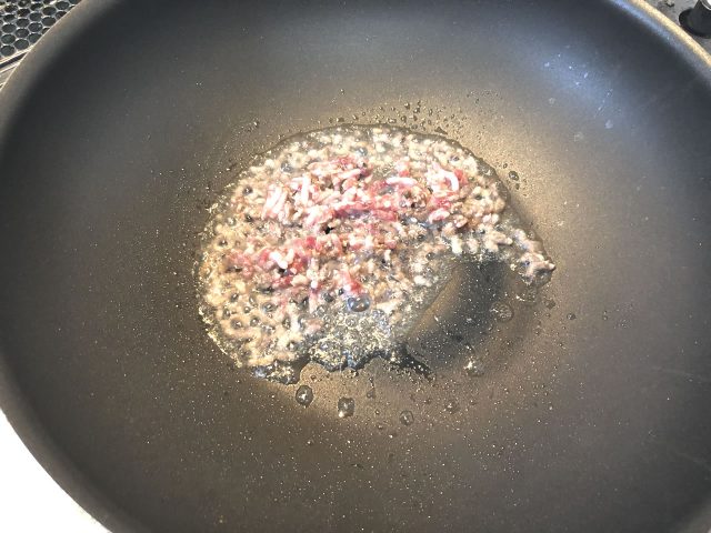 油を引かずひき肉を炒めます。塩コショウでちょっとだけ味付け。出てくる油が大事!