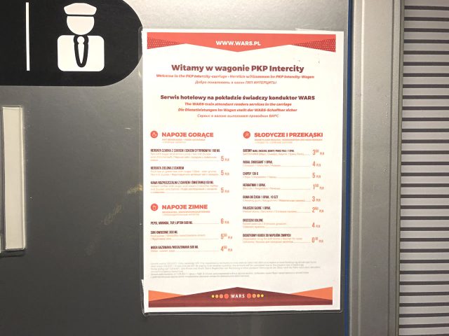 車内販売のメニュー。一番高い商品はソフトドリンクの6PLN(ズウォティ)で約170円。