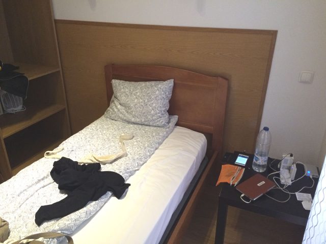 シャワー、トイレは共有なのでベッド、テレビ、サイドテーブルが全ての備品です。