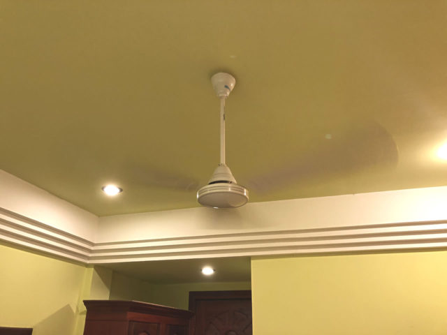 シーリングファン。ベッドに寝転んだ時、体に直接風が当たらない絶妙な場所に設置されています。