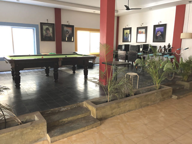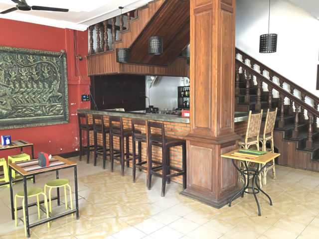 真ん中奥に見えるのが厨房?。左側に見えるテーブルで食事ができます。夜はアンコールビールの生も楽しめます。客室は2階以上にあるので右側に見える階段で上ります。