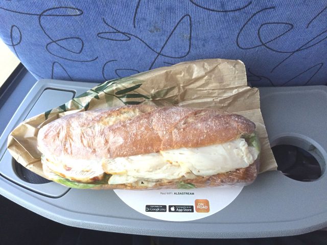 6時間以上の乗車時間にもかかわらずトイレや食事休憩というものは無く、お客が降りて預けた荷物を受け取っている間にダッシュするという感じ。写真のサンドウィッチもそうやって購入したものです。