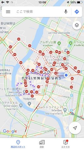 カオサン通りに向かうバスでgoogle mapを立ち上げた時の画像。広い範囲で交通規制が行われているのが分かります。