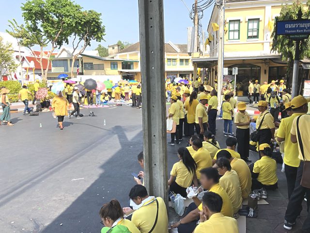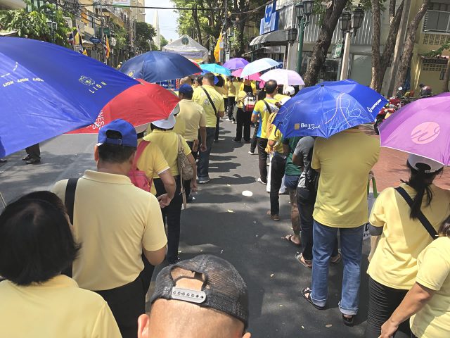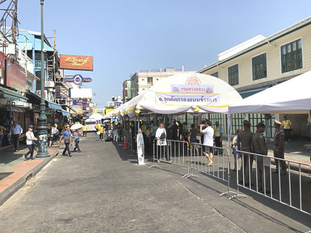 この時点では「自分はパレードは見ず、ちょっとカオサンへ行くだけだからセキュリティチェックは不要」と思ってました。小道から突破しようとしましたが警備は万全、「ここから中へ入るにはいかなる理由であれセキュリティチェックを通る必要がある。」と言われました。