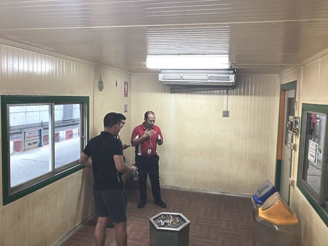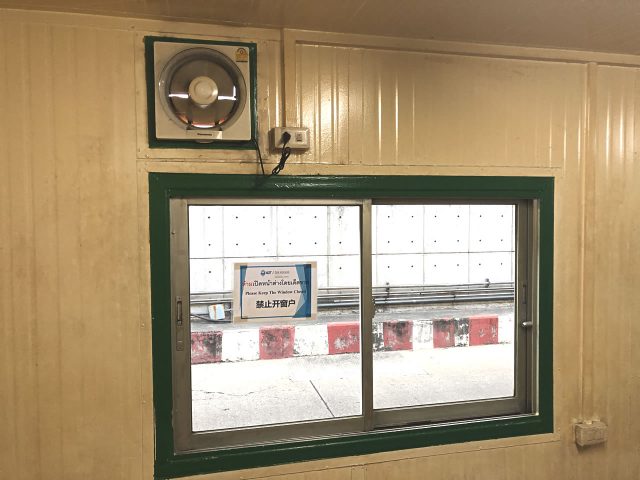 コンテナに灰皿、エアコン、窓、換気扇を設置した内装。灰皿はこれまで(全面禁煙前)に使っていたものの流用でしょうか。懐かしい感じがします。