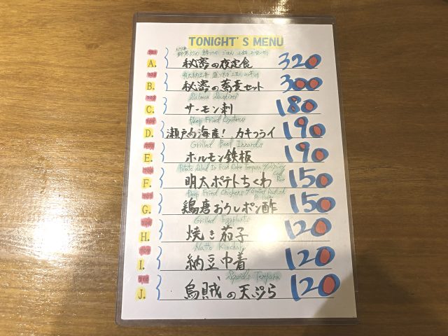 今夜のメニュー。居酒屋定番メニューが並んでいます。「秘密の蕎麦セット」って何でしょうね。