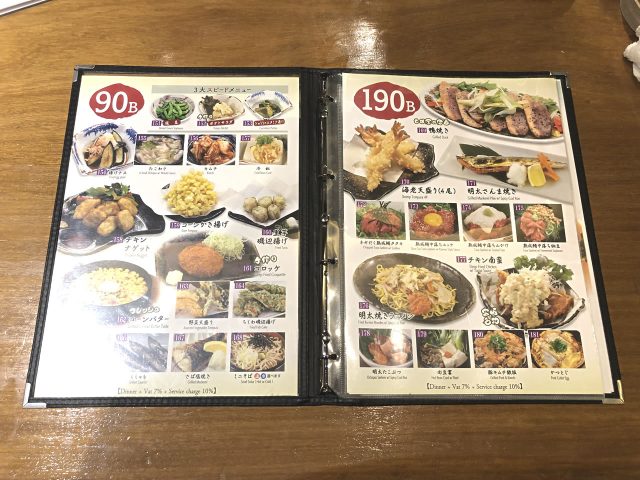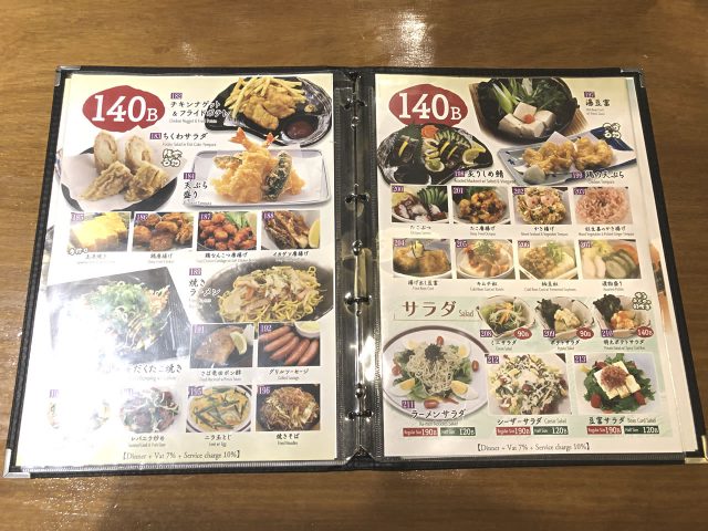 アルコール類は営業時間中いつでも飲めますが、17時から本格的な居酒屋メニューが提供されます。今夜のメニューと鍋を除けば「90バーツ」「140バーツ」「190バーツ」の3種類。明朗会計ですね。