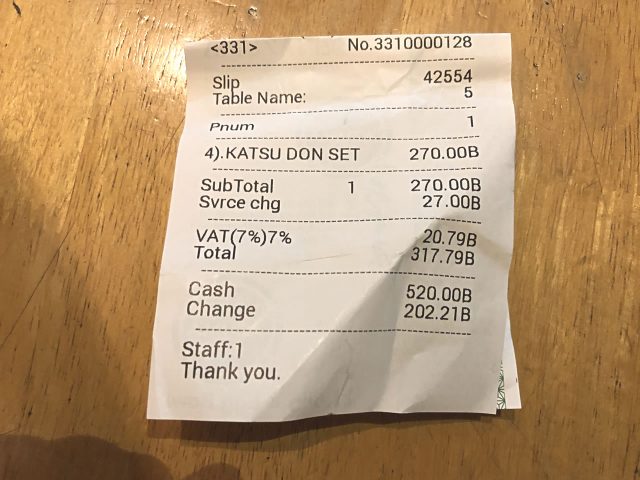 270バーツのかつ丼セットは本体270バーツ+サービス料27バーツ+税金20.79バーツで合計317.79バーツになります。