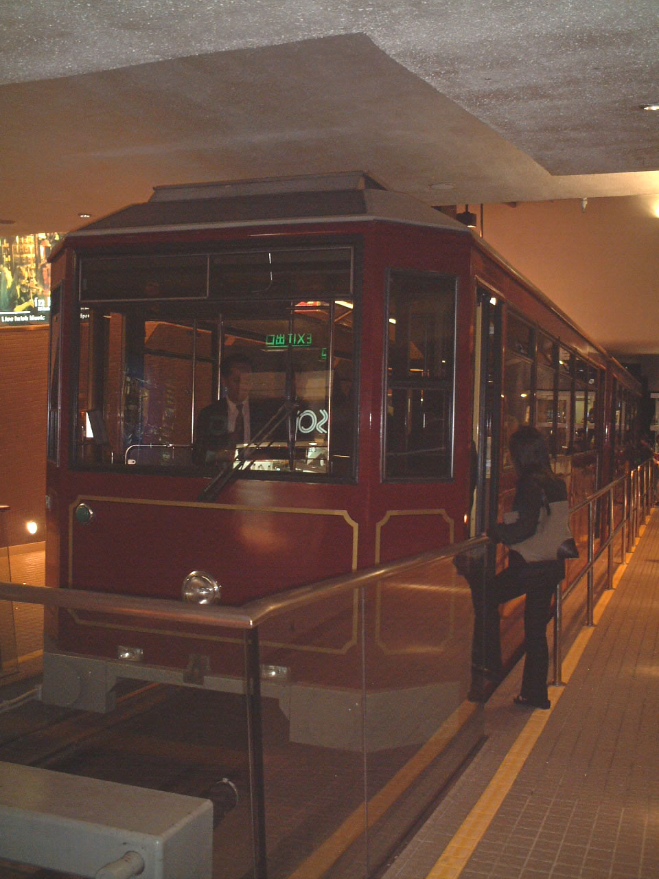 ピークトラムとは、ふもとから標高373mにある山頂までの1.4kmを約8分で登る登山列車で、香港最初の公共交通機関である…らしい。それはもう、ものすごい急角度で登っていく。
