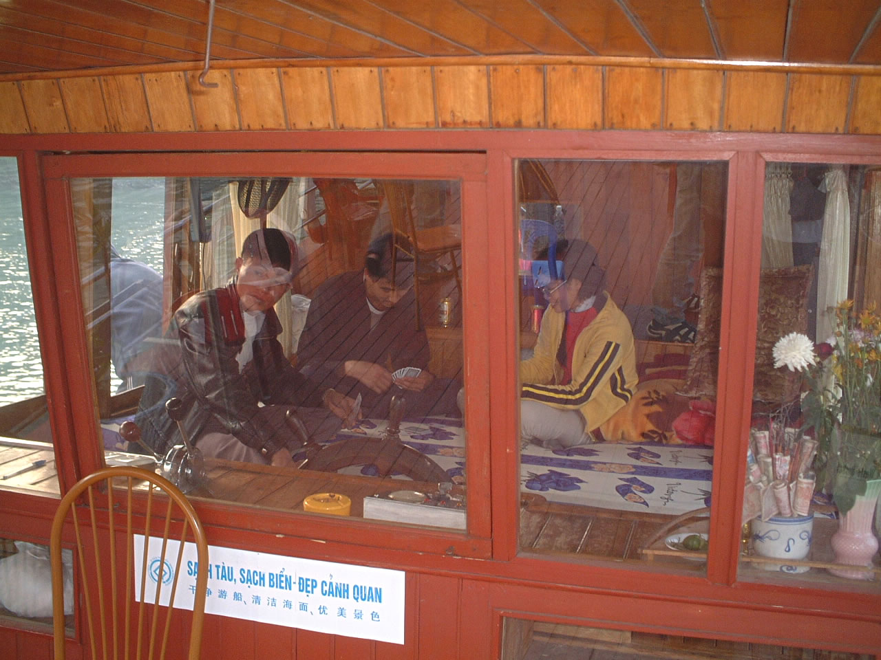 そんな自分に添乗員(この人はなかなかの働き者だった)が操舵室に来ないかと声をかけてくる。興味があるので早速中に入る。風もさえぎり、座敷のようになっていて、結構快適。さらに「簡単だから運転してみる?」なんて言われたが、さすがにそれは遠慮する。大海原を自由?に動ける魅力に取り付かれ、船舶免許とクルーザーが欲しくなってしまった。