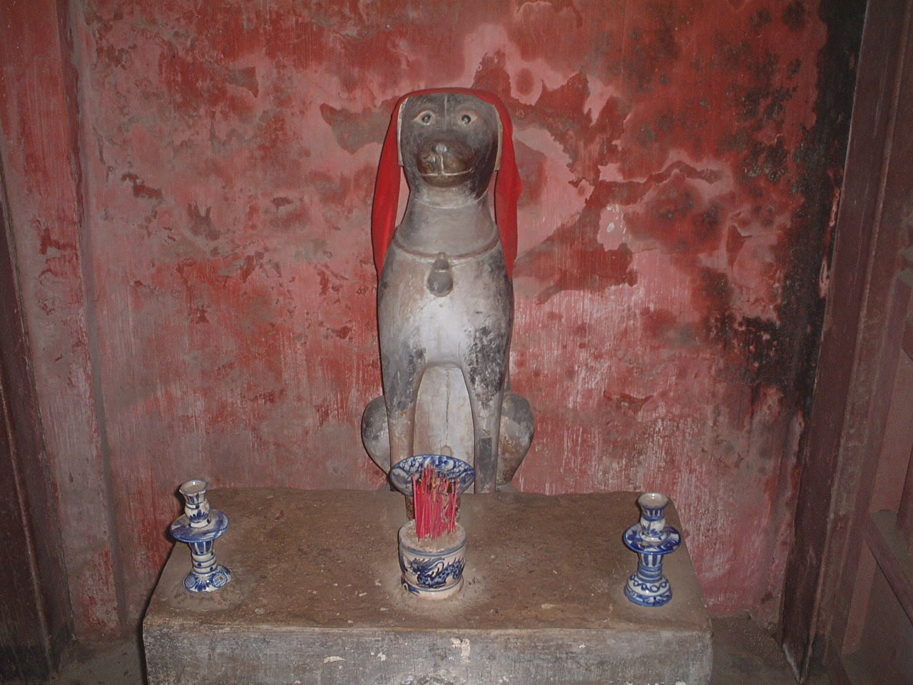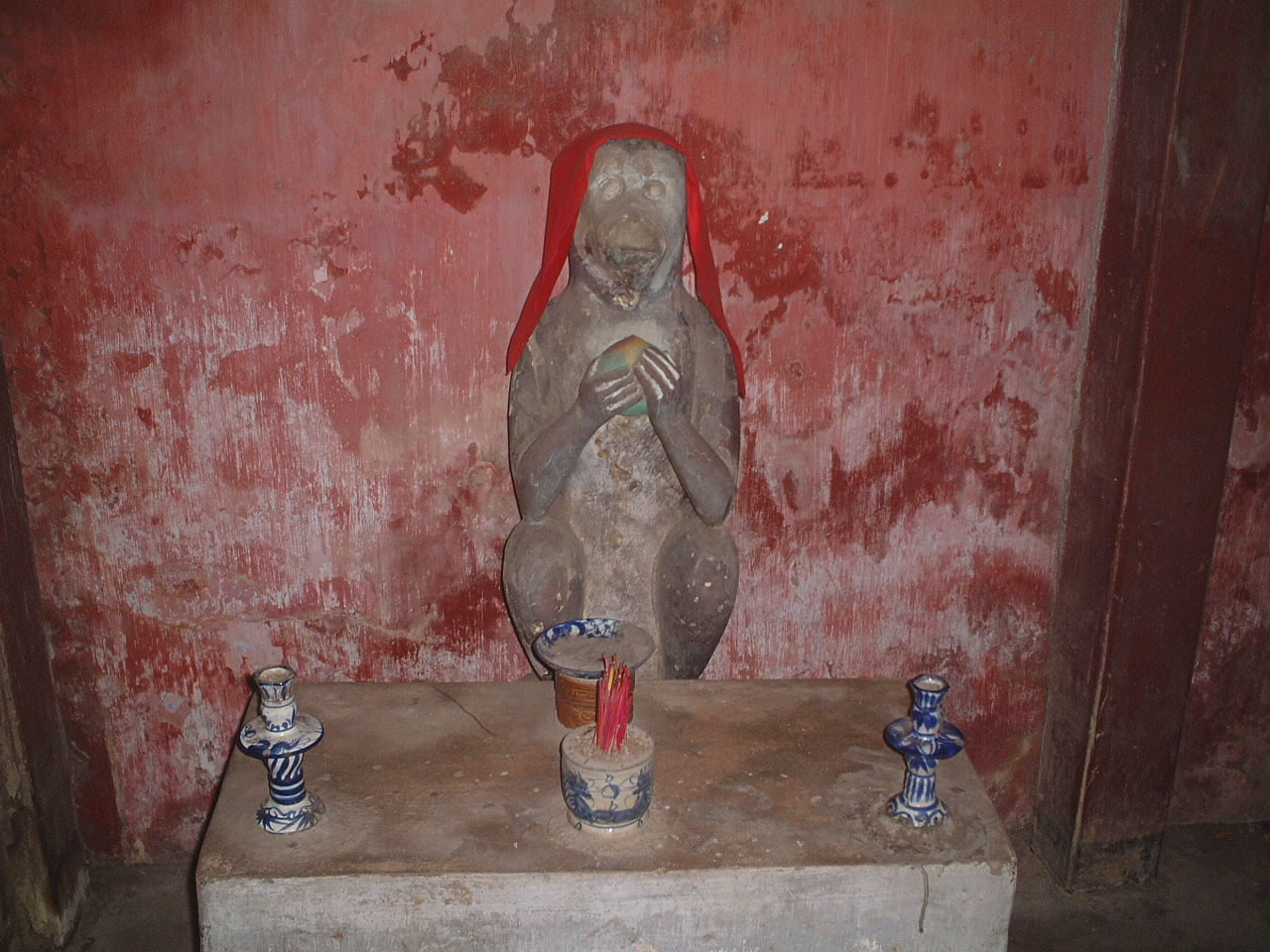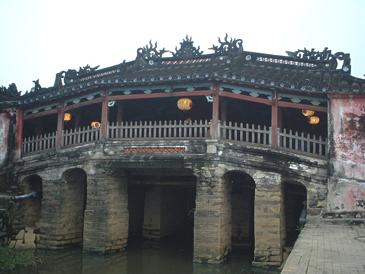 フエのシンボル的存在?の来遠橋(通称日本橋!)を見る。橋の端(一休さんのようだ)には犬と猿の像があった。当時この橋を挟んで日本人街と中国人街があり、両者はとても仲が悪かった。そこから仲の悪い者の例えを「犬猿の仲」と言うようになったという嘘のような本当の話?