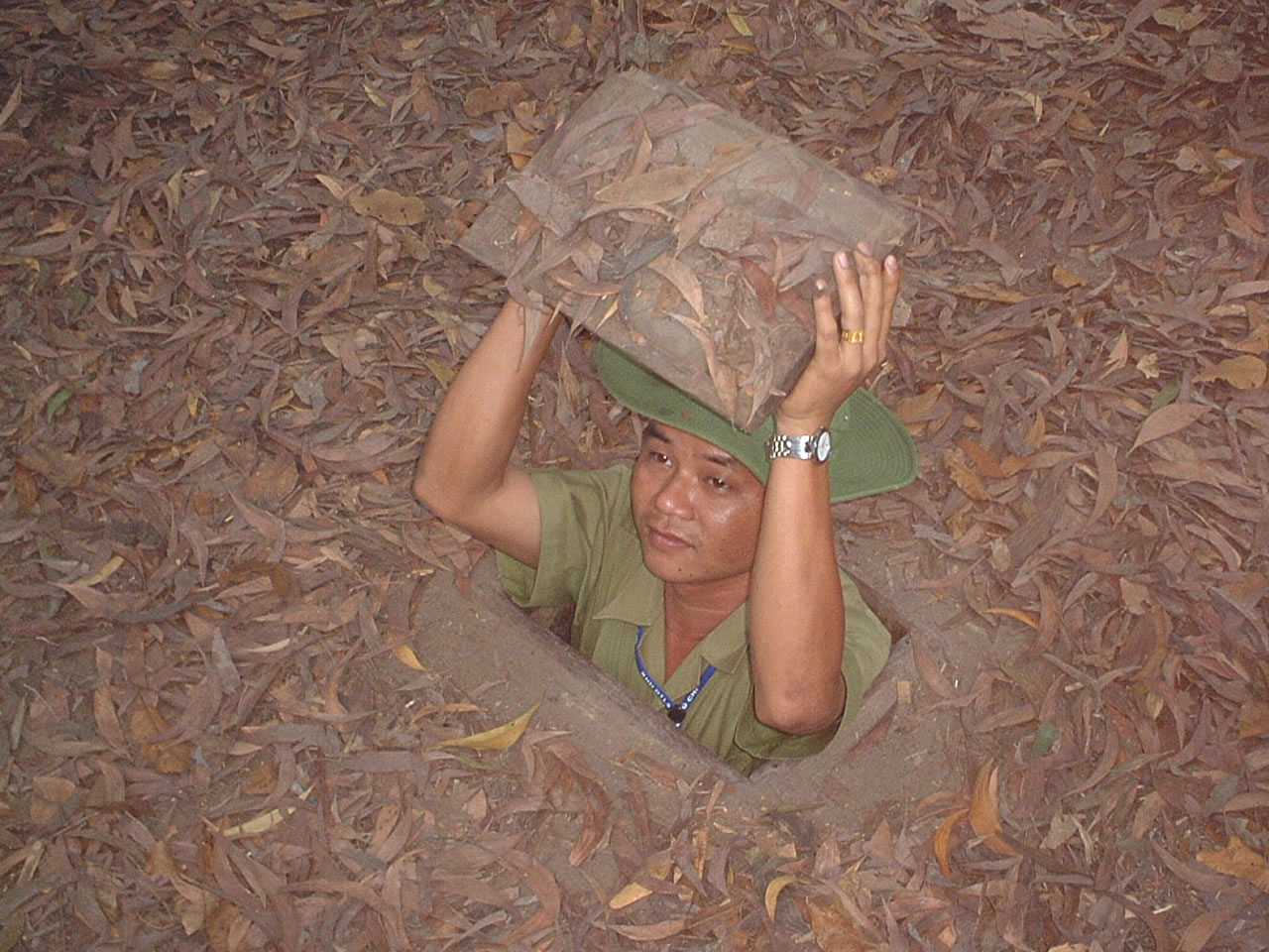 次にトンネルの入り口探し。ツアー客全員であちこち探し回るが、一向に見つからない。ガイドが「ここだよ」と草をどけた場所はわずかブロック1個分の穴が開いているだけ。「本当に入れるのかよ?」と思ったが、彼は器用に入り込んでいった。説明によると入り口が小さいのは、見つけづらくするのはもちろんの事、万一見つかっても体の大きいアメリカ人が入り込めないようにするためらしい。よく考えている。