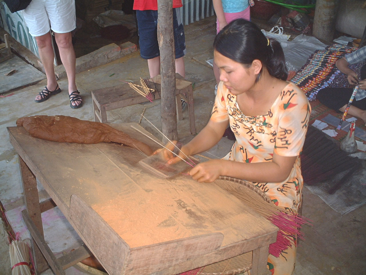 再度メコン川を下り、バスに戻り移動。フェリーでバスごと川を越え、国境の町「チャウドック」に到着。ここで線香作りも見学する。線香も1本1本手作りなのには本当に驚いた。