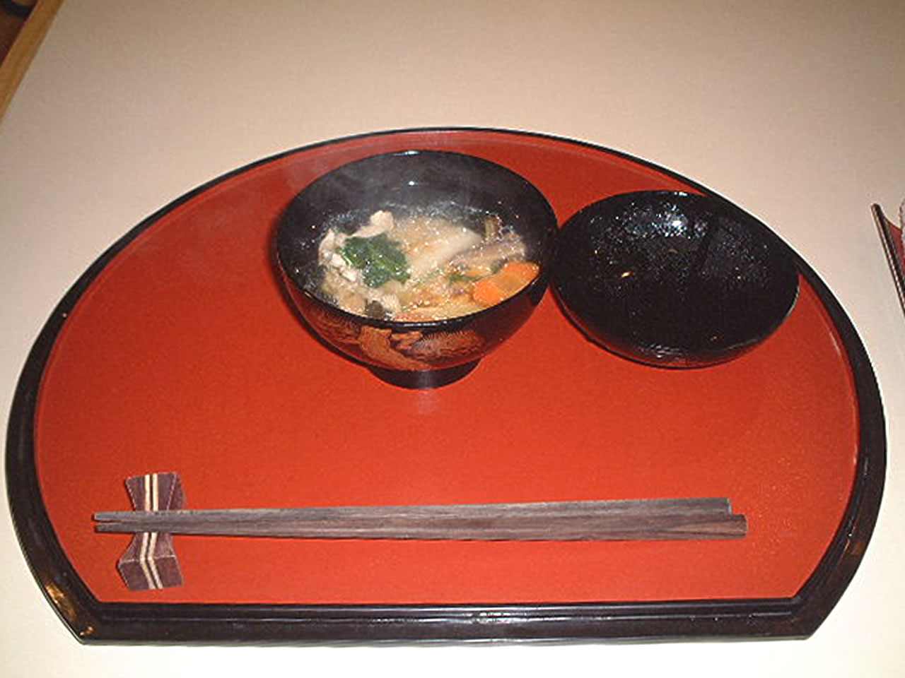 珍しく08:30起床。宿1階にある日本食レストラン「竹亭」で目に付いた「お雑煮あります」の看板に飛びついてしまう(60B)。いいねぇ〜、お正月らしくて、うん。