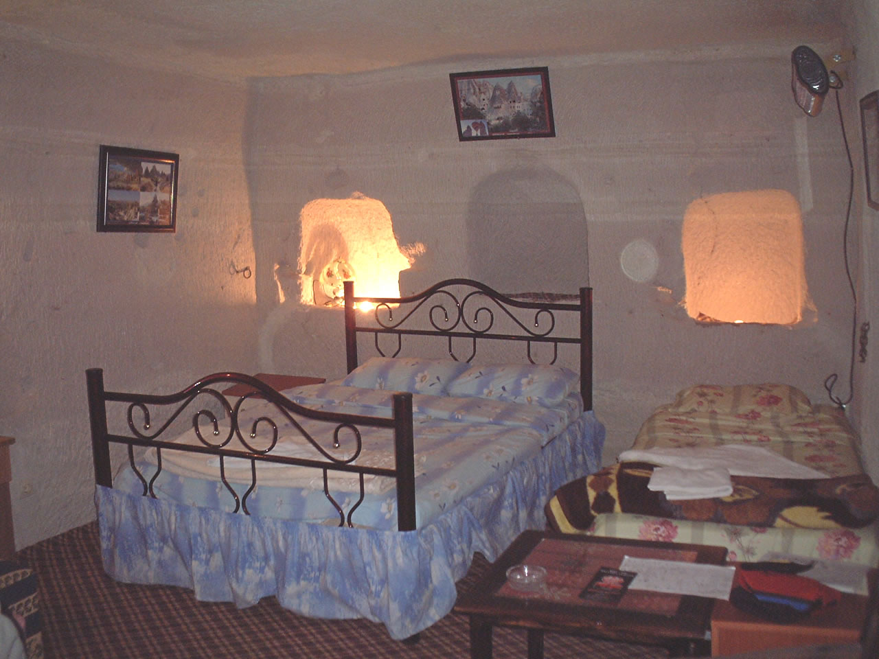 当たりを付けていた「ufuk motel pension」へ行く。洞窟部屋を3部屋とそれ以外の2部屋を見せてもらう。値段を聞くと50YTL。こちらが何も言う前に40YTLにしてくれると言ってくれたけど、他の宿も見たいので隣の「アナトリアムホテル」へ行く。