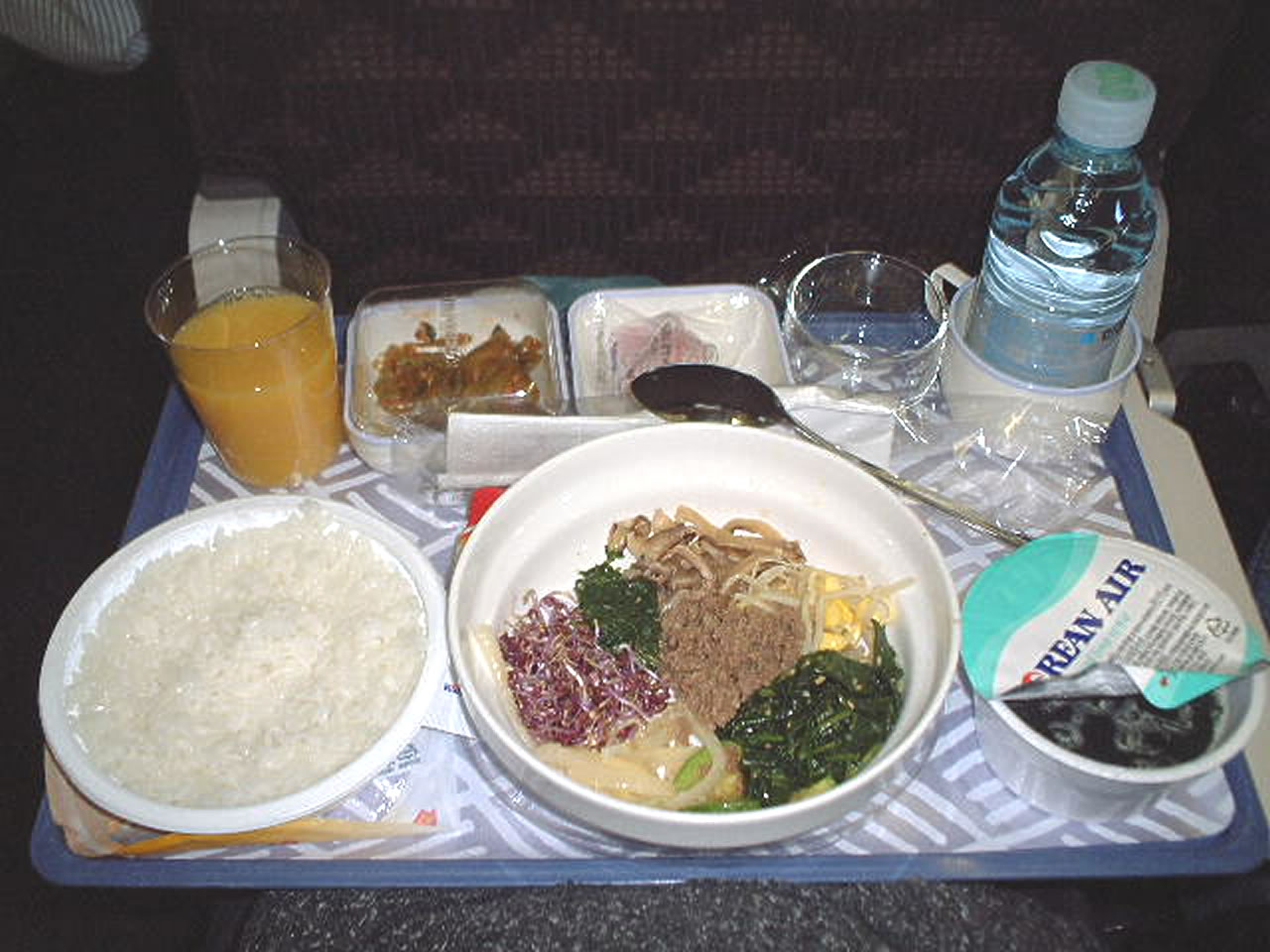 食事は2回のスナックタイム(内1回はコンビニのおにぎり)と2回の機内食(1回めのビビンバは本格的で美味しかった、しかも食べ方が分からない外国人用に説明書もあり)。
