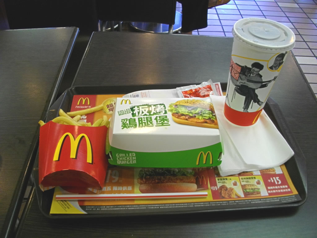 とりあえず「マック」で休憩。ご当地マックの「板烤鶏腿堡」を注文。