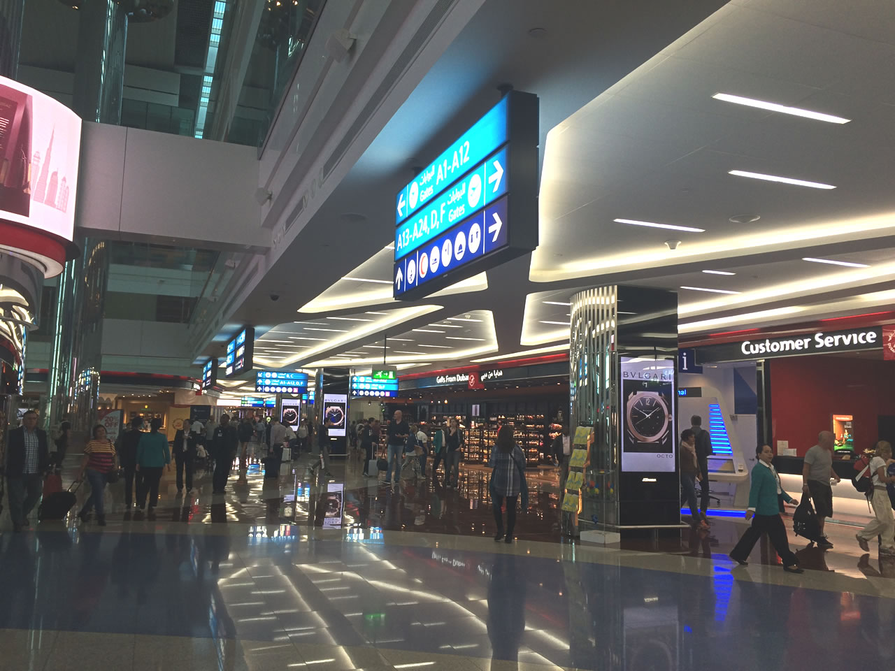 予定より30分程早く、05:00頃ドバイ国際空港着。乗り継ぎ時間が1時間半しか無いので心配していたけど早く着く分には問題なし。簡単なチェックを受けバルセロナ行きのゲートへ向かう。ちょうど喫煙所を見つけたので一服にありつける。しかし朝5時というのに賑やかだね。