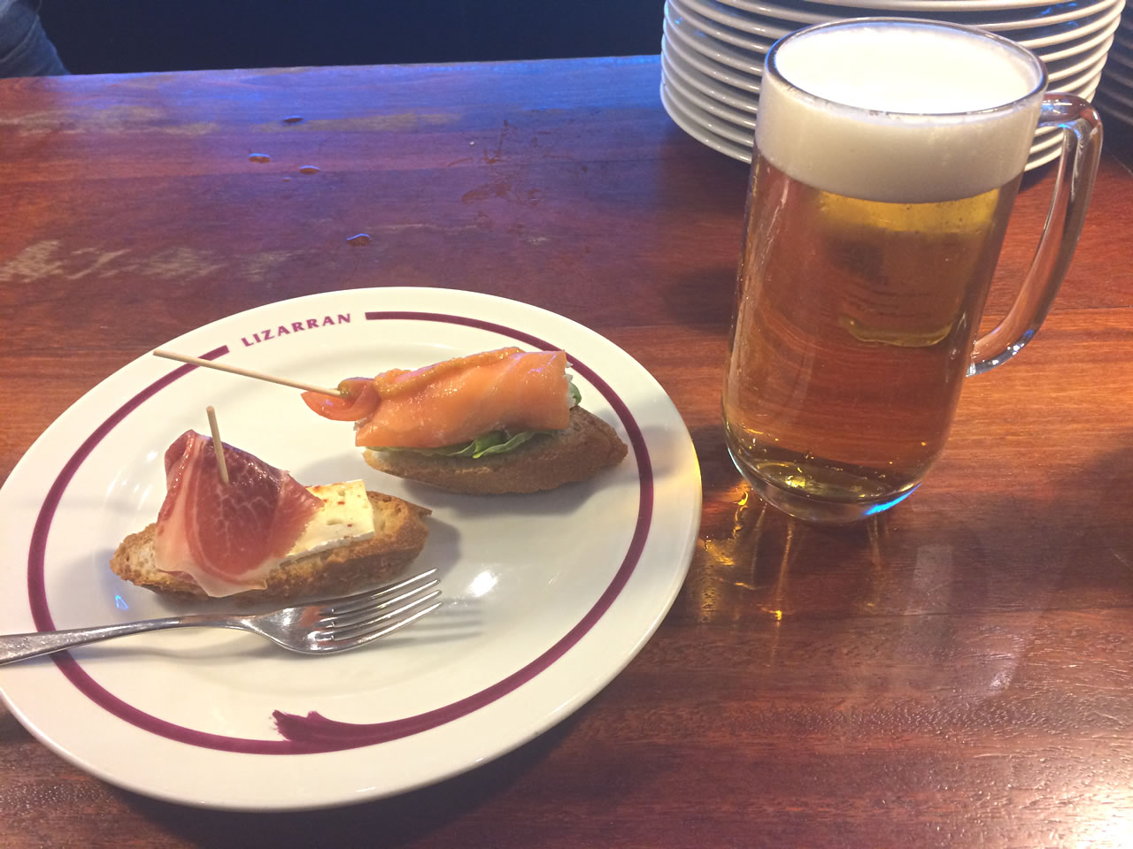 ビール大ジョッキを注文し適当にタパスを取ってくる。たまに定員が大皿にタパスを乗せ回っていて気に入れば取る、いい雰囲気。