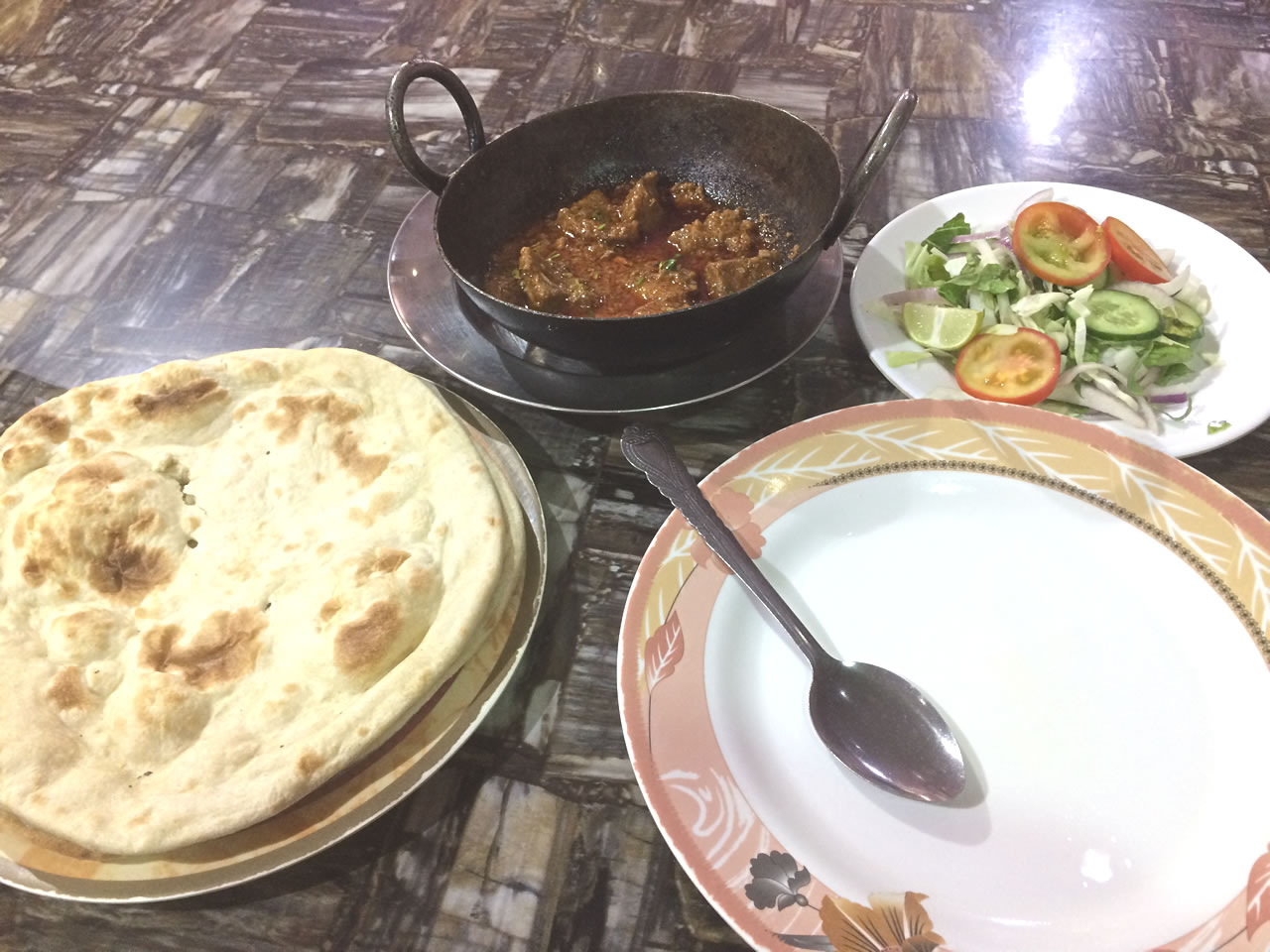 やはり昨日の店で食事。今日はマトンKADAI。骨付きの肉がおいしい。この店いいなぁ(毎回注文したチャイが出てこないけど)。