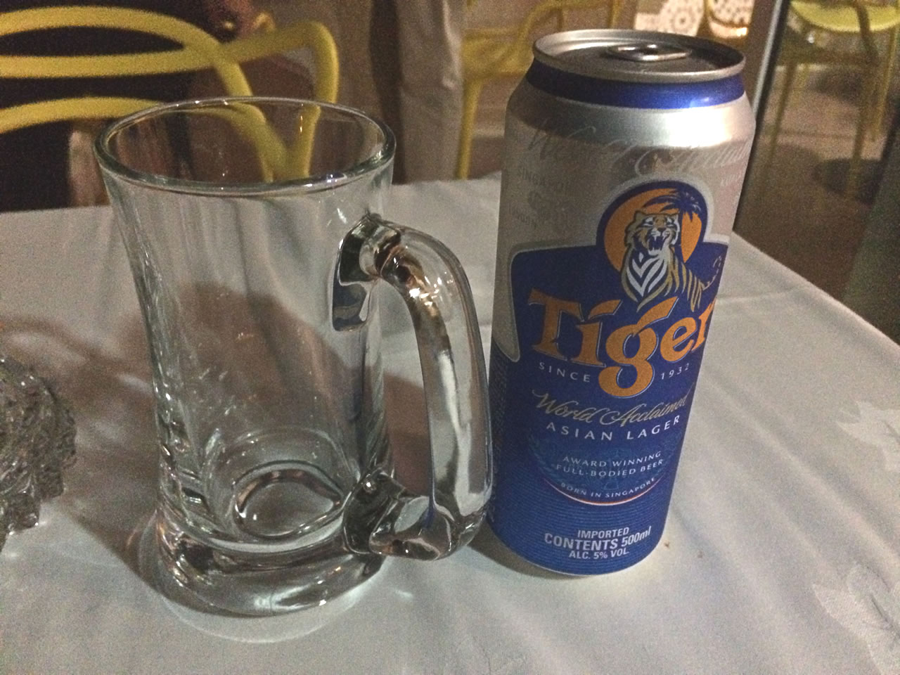まずはタイガービールを注文。テラス席へ座ったのでタバコも吸え、港の夜景も一望でき、風も心地良い。