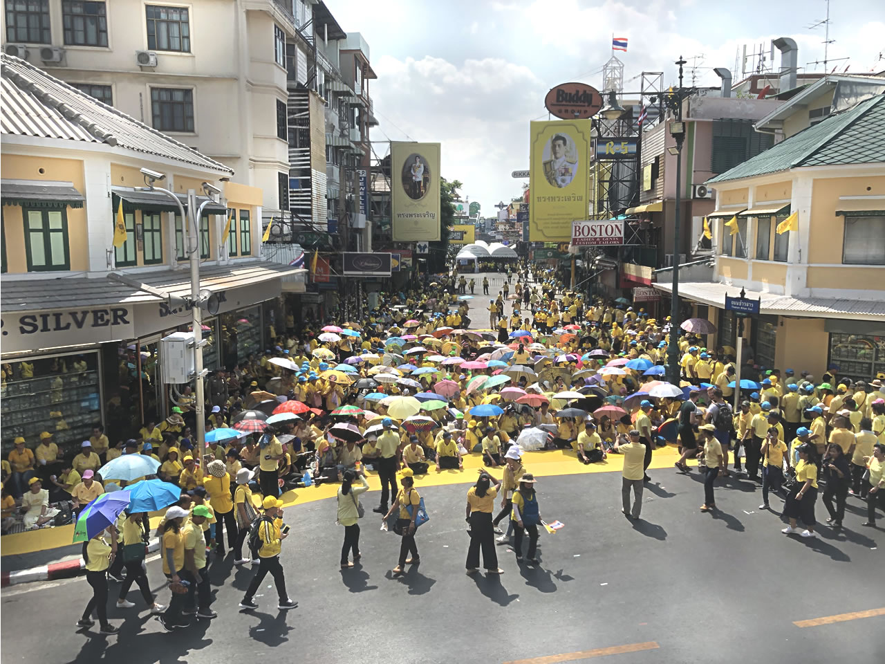 さてカオサン。完全に封鎖されていて、開いているお店はほぼ無し、さすがキングパワー。隣のランブトリーも同じ状況で人もまばら。とりあえず自分も黄色いTシャツを買う。
