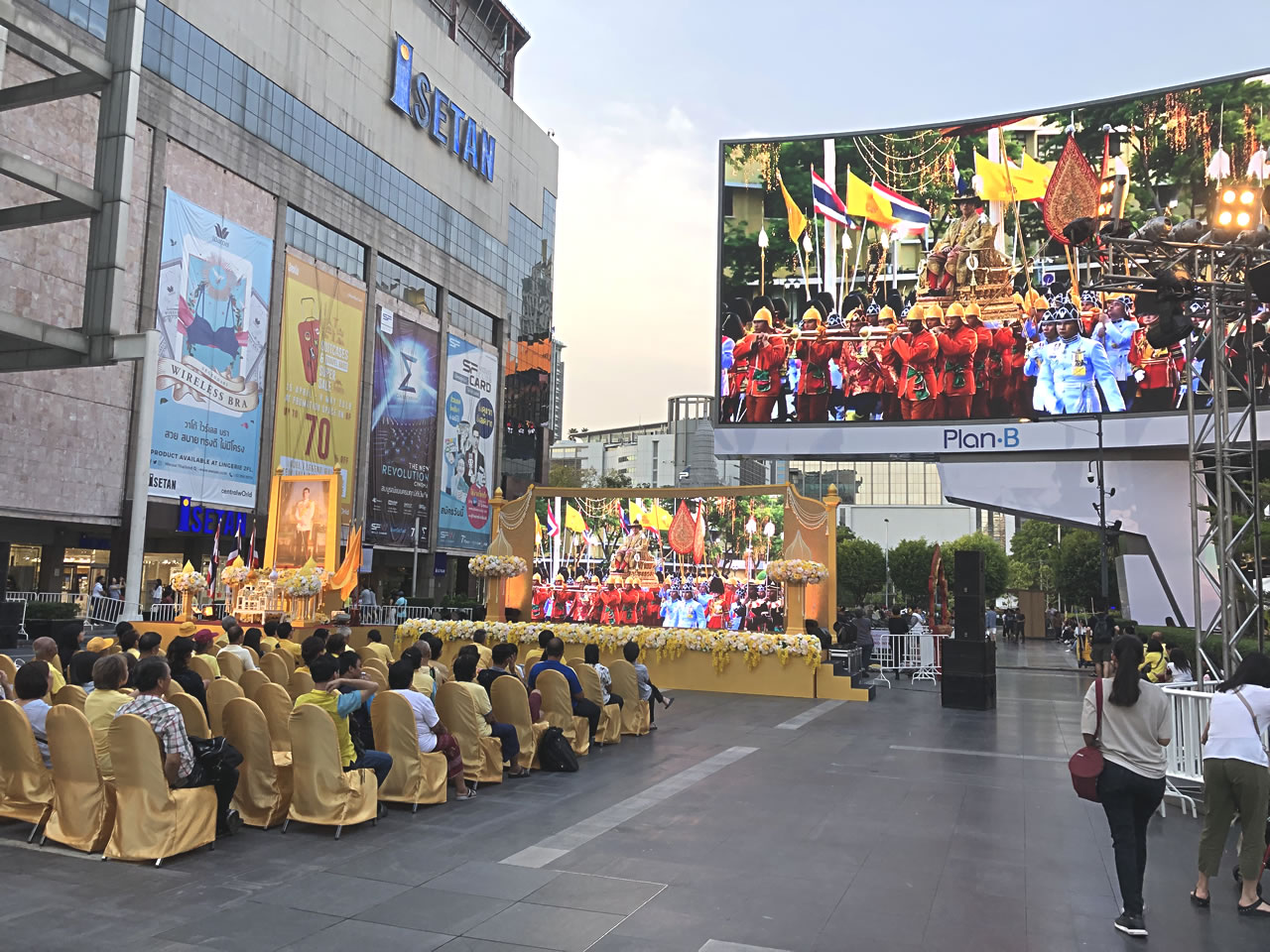 BIG-C、イセタンとまわる。ちょうどイセタン前の大型モニターにパレードの様子が写っていた。椅子も置かれちょっとしたパブリックビューイングの様。モニターを見てびっくり。パレードって自動車で回るものだと思ってたんだけど、国王はなんと神輿(もちろん人力)に担がれ移動していた。国王も担ぐ人達も、そして一緒に回っている人達も大変そう…。