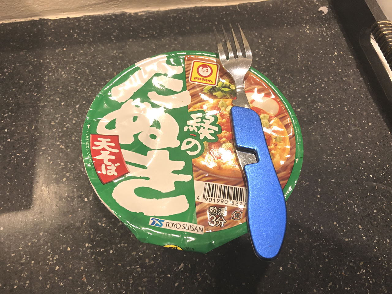 まずはちょっとお腹が空いたので年越しそば代わりに持ってきた「緑のたぬき」を食べる。