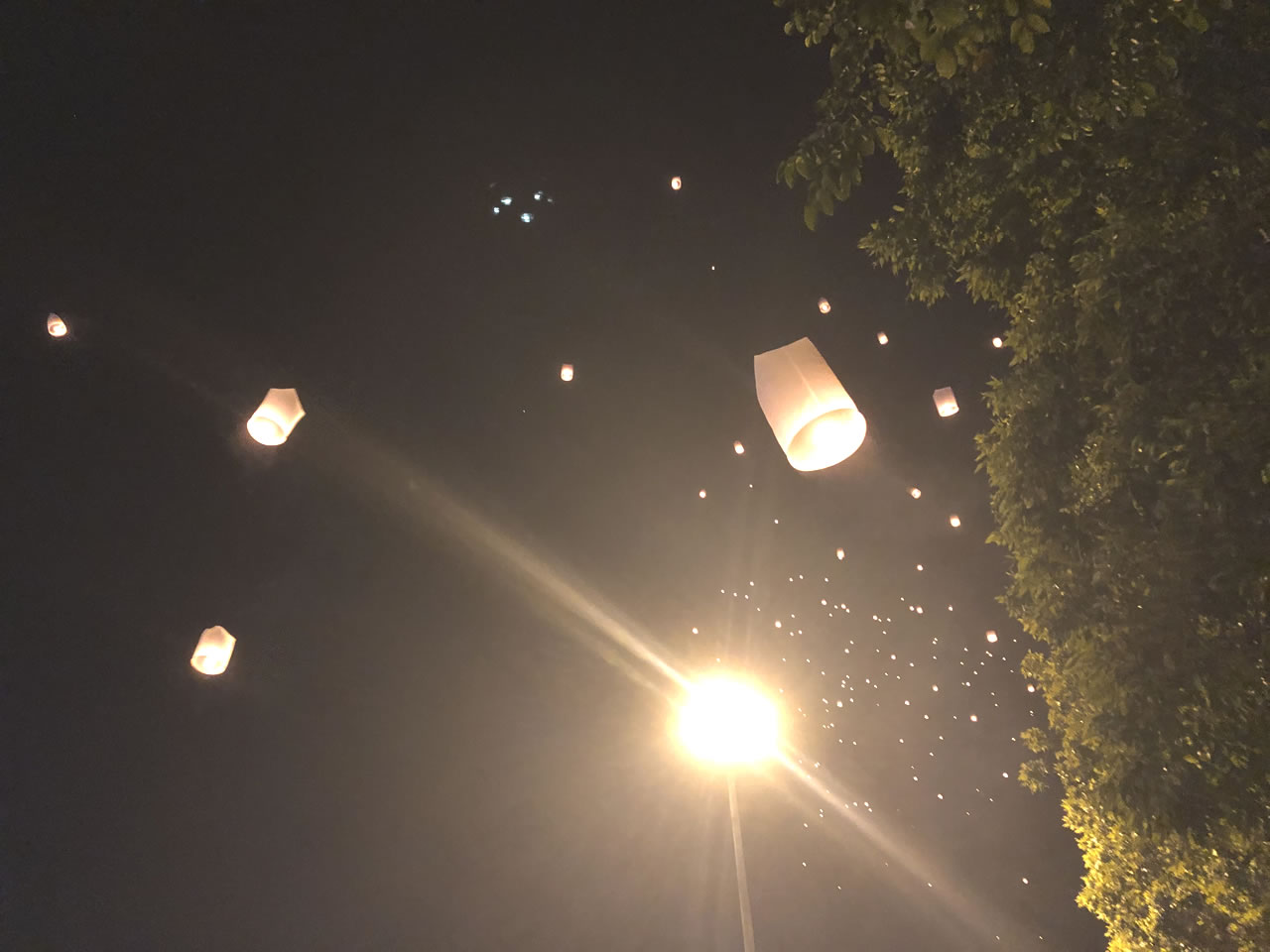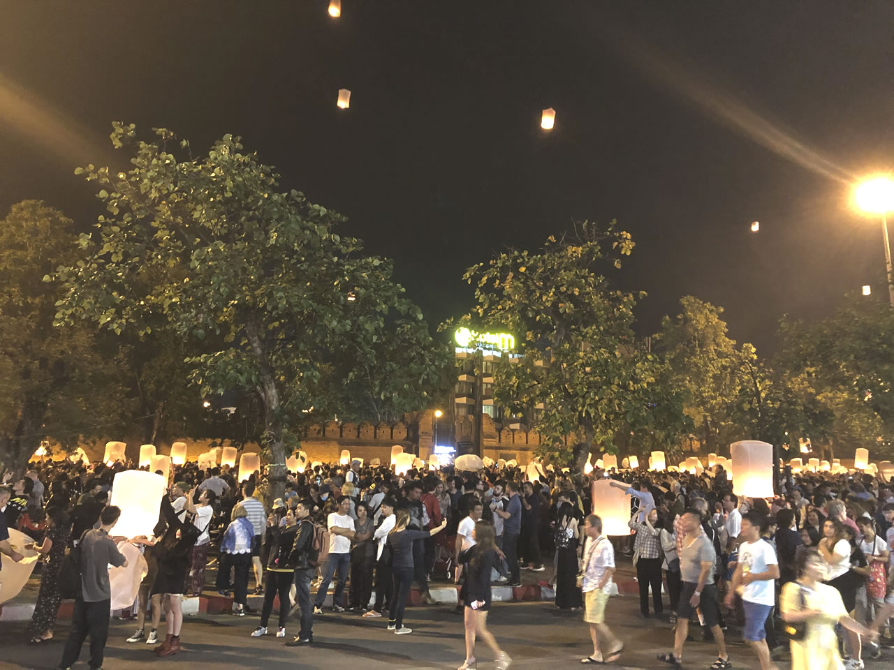 22:45、カウントダウンに向けてターペー門方面に向かう。途中、暗闇に多数の赤い光が見える。「チェンマイに高層ビルなんてあったっけ?」と勘違いしたその光こそ昇っていくコムローイだった。心が高まる。