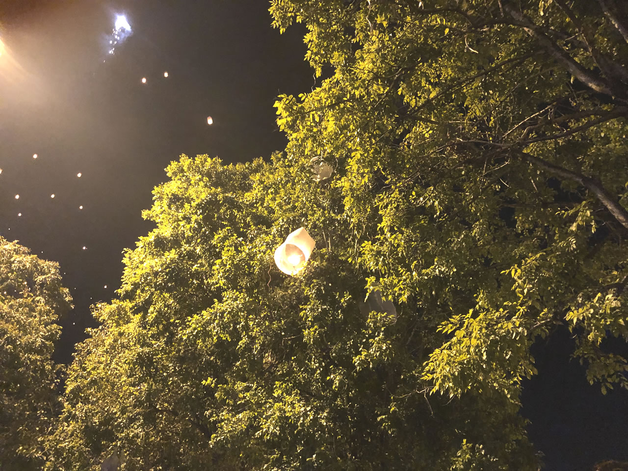 ところでこのコムローイ、もちろん全てがうまく飛んでいく訳ではなく、途中の木や電線に引っかかるものもある。見た所、消防の用意らしきものは見当たらないけど火事とか大丈夫なのかなぁ。電線が燃えて断線して正月早々停電とか嫌だなと心配してしまいました。