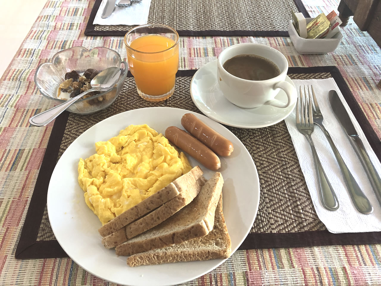 09:15頃起きて朝食を食べに1階へ。コーヒーやジュース、シリアルはセルフ。食パン2枚とソーセージ2本、炒り卵、デザートが出てくる。朝食としてはいい感じ。