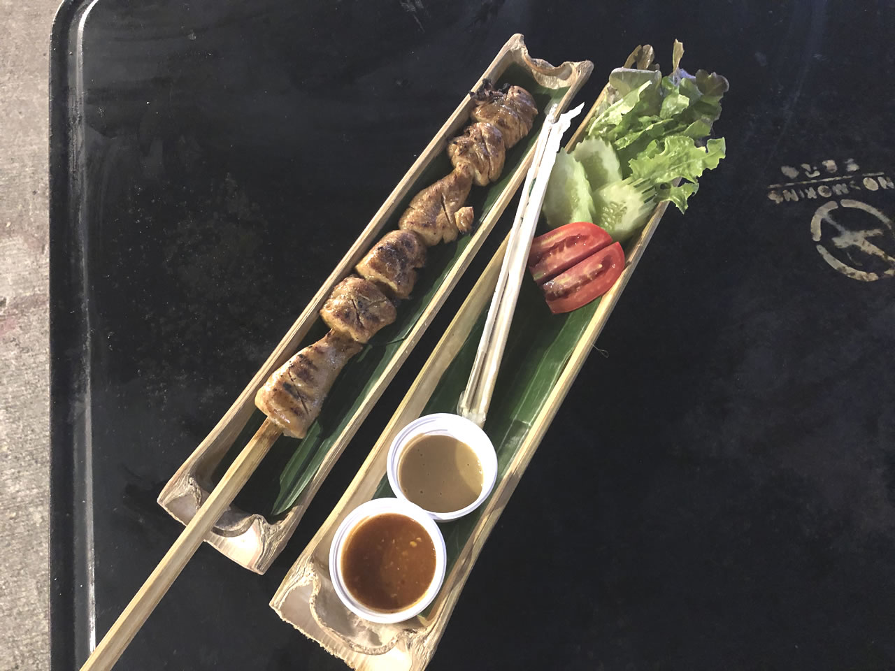 お店を見て回っているうちに、もう我慢できなくなって、竹製のお皿に盛られた大きい串焼きを食べちゃいました。
