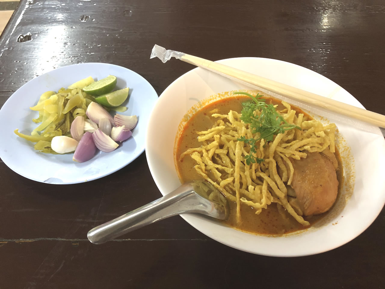 カオソーイとはカレースープに卵麺、更に揚げた麺を乗せたご当地グルメ。主にタイ北部で食べられていると聞いたので今回の目的の一つにしてました。B級感満載で自分好み。もちろん味はA級でした。