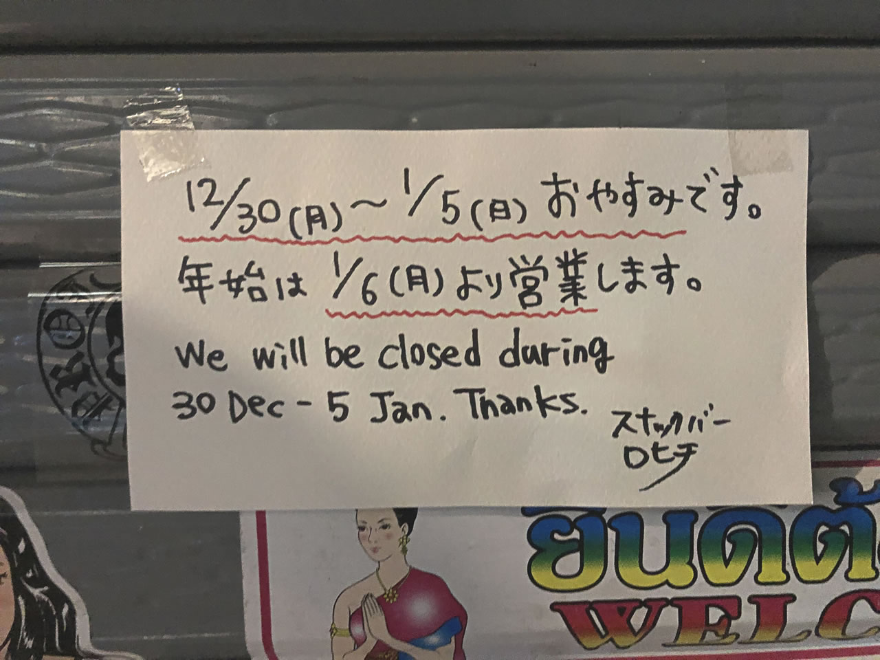 タクシーでトンローへ。スナックちひろへ向かうと1月5日まで休みだって。あれ、今年は書き初めできないなぁ。